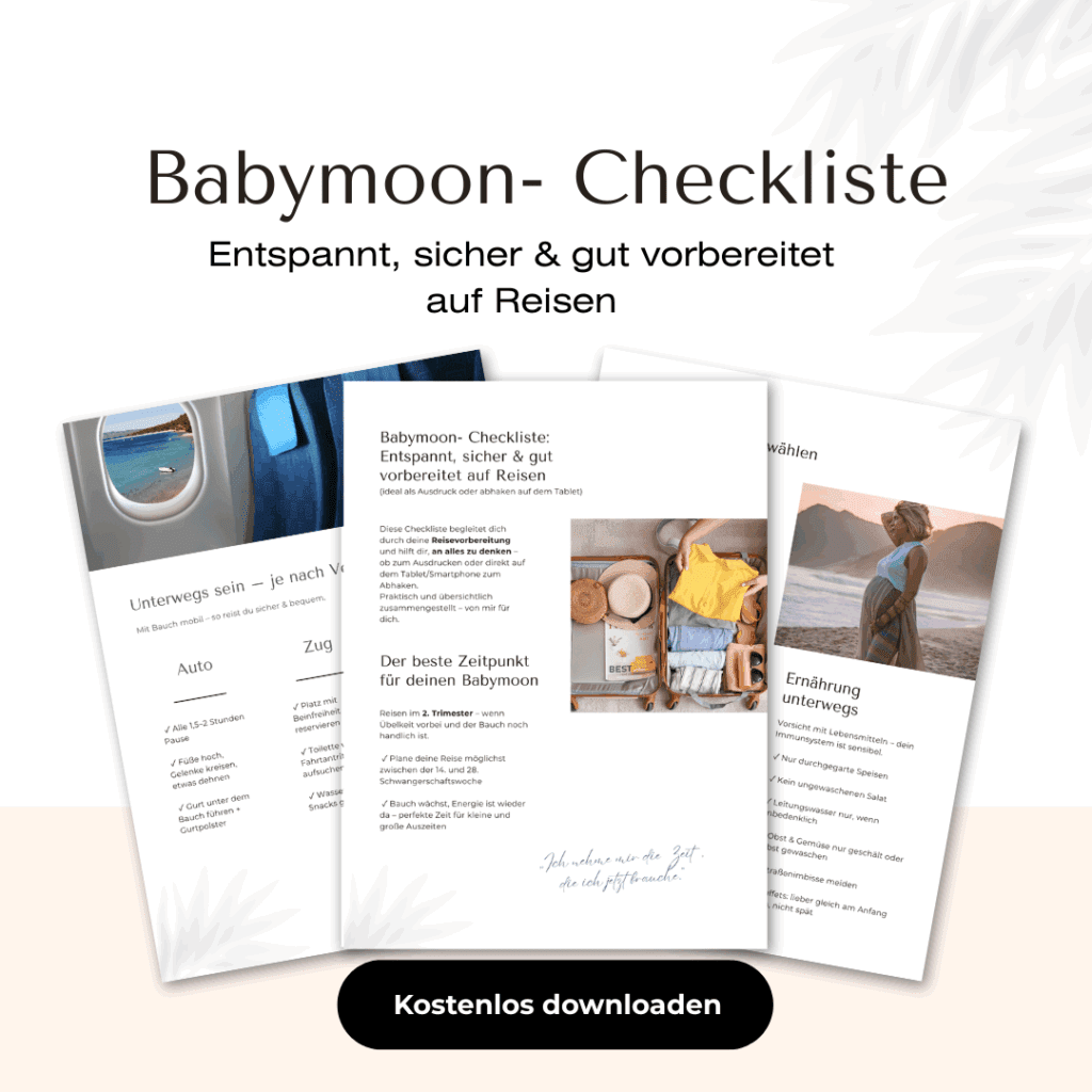 Damit du entspannt und sicher unterwegs bist, habe ich eine praktische Babymoon-Checkliste für dich erstellt – damit du nichts Wichtiges vergisst.